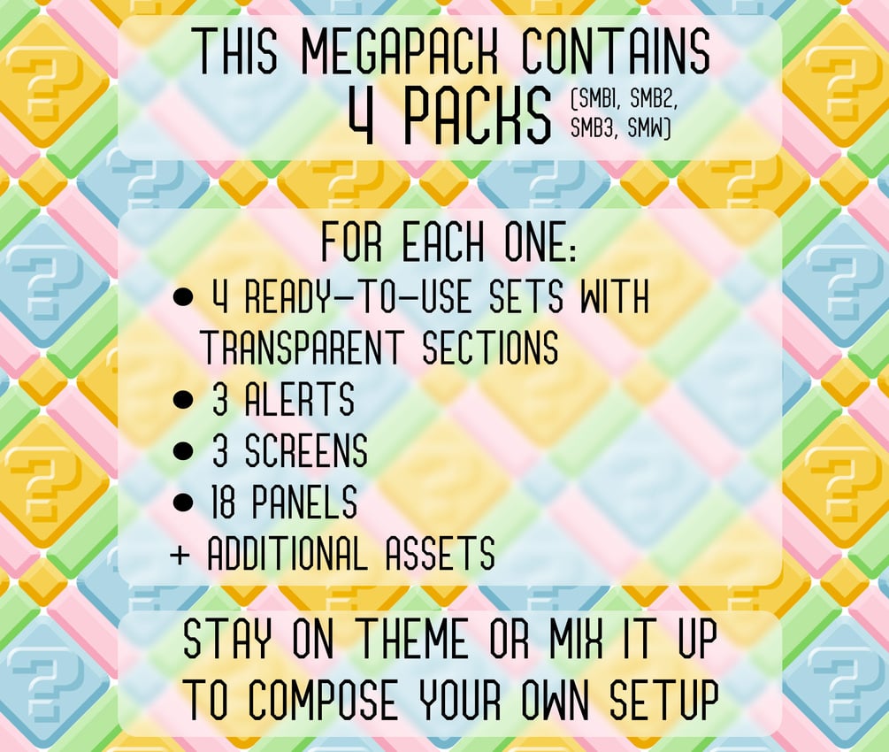 The package contains overlay for streaming such as twitch. It is inspired by Super Mario Bros / World / All-Stars.