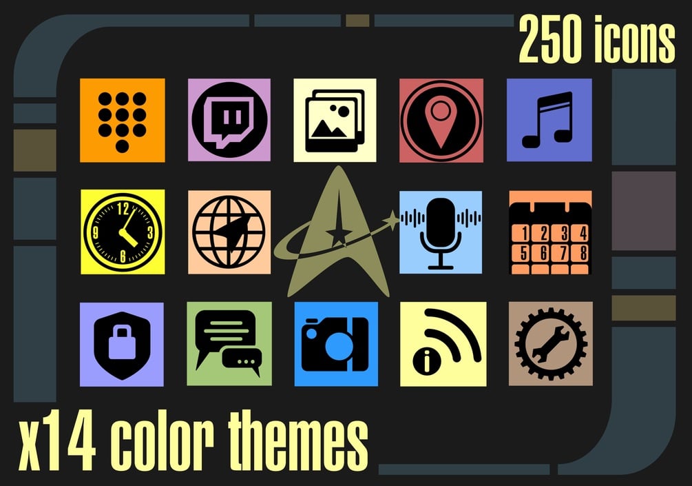 These original 250 icons are inspired by the design of "Star Trek: The Next Generation" (CBS). The colors match the "LCARS" screens used in Federation starships such as the Enterprise. The icons come in black and 14 different color palettes.