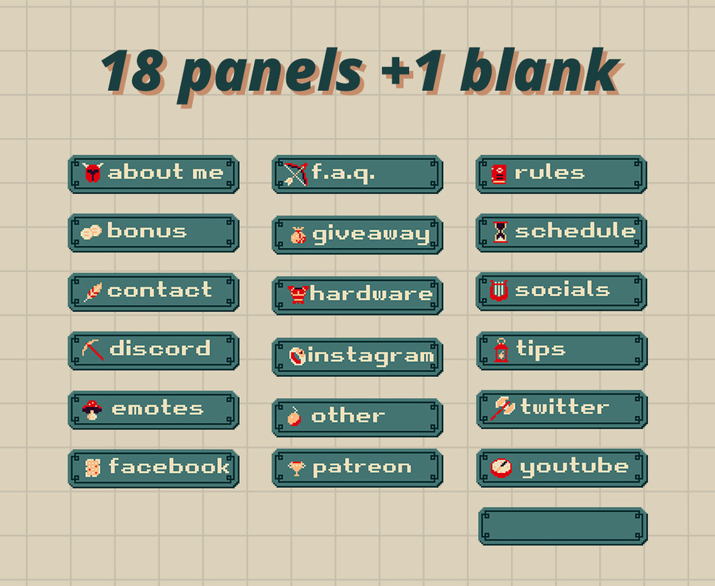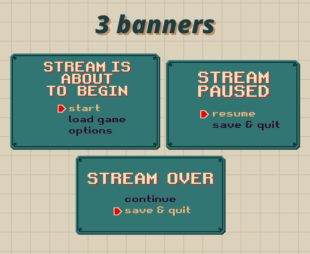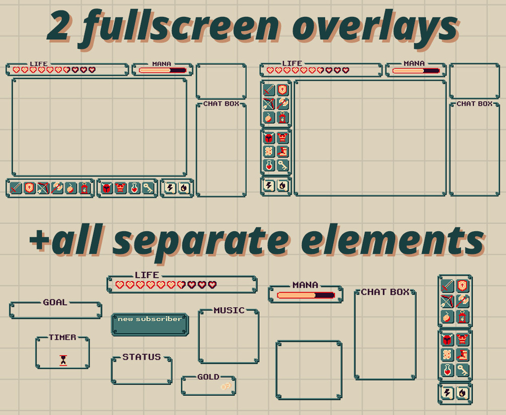 The package contains overlay for streaming such as twitch. It is inspired by 8 bit RPG video game aesthetics.