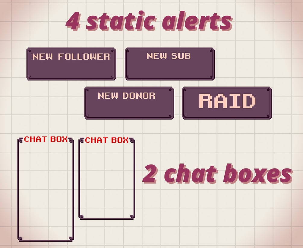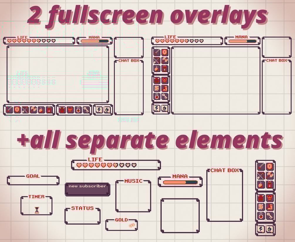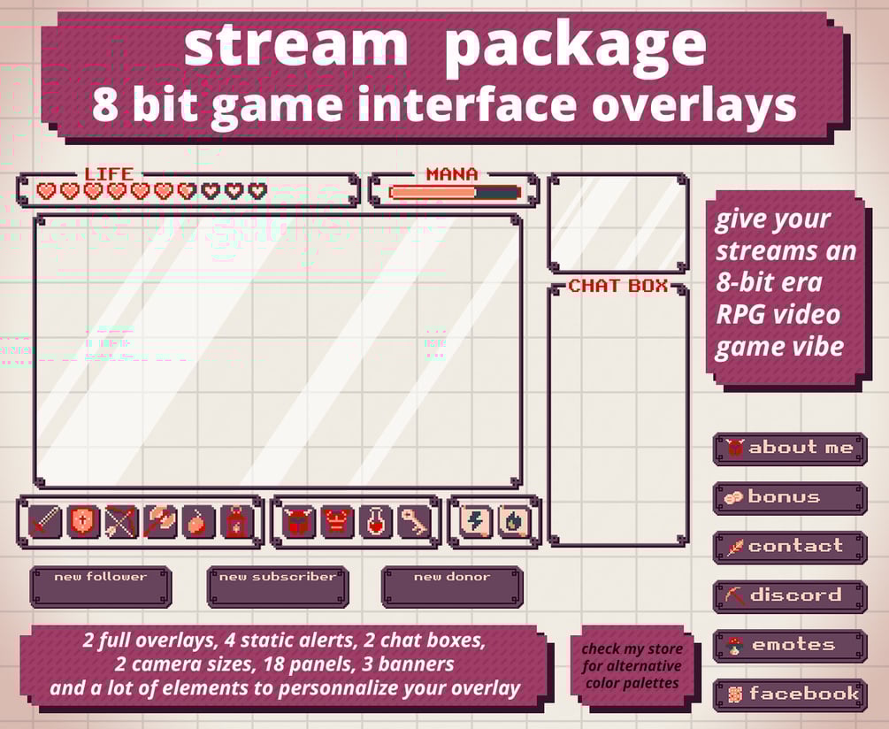 The package contains overlay for streaming such as twitch. It is inspired by 8 bit RPG video game aesthetics.