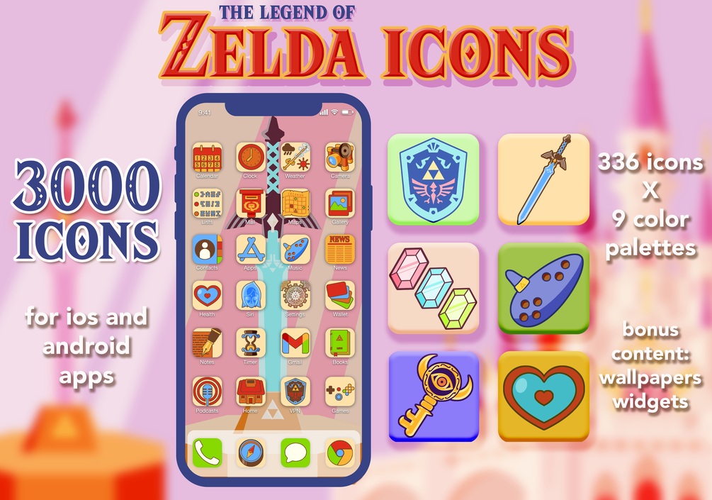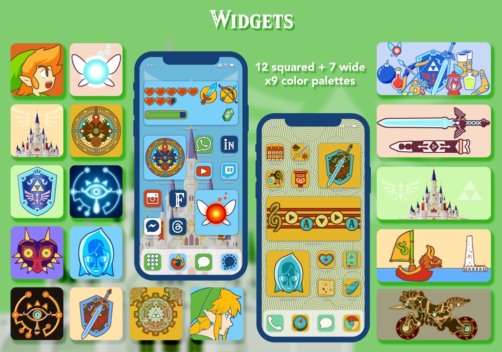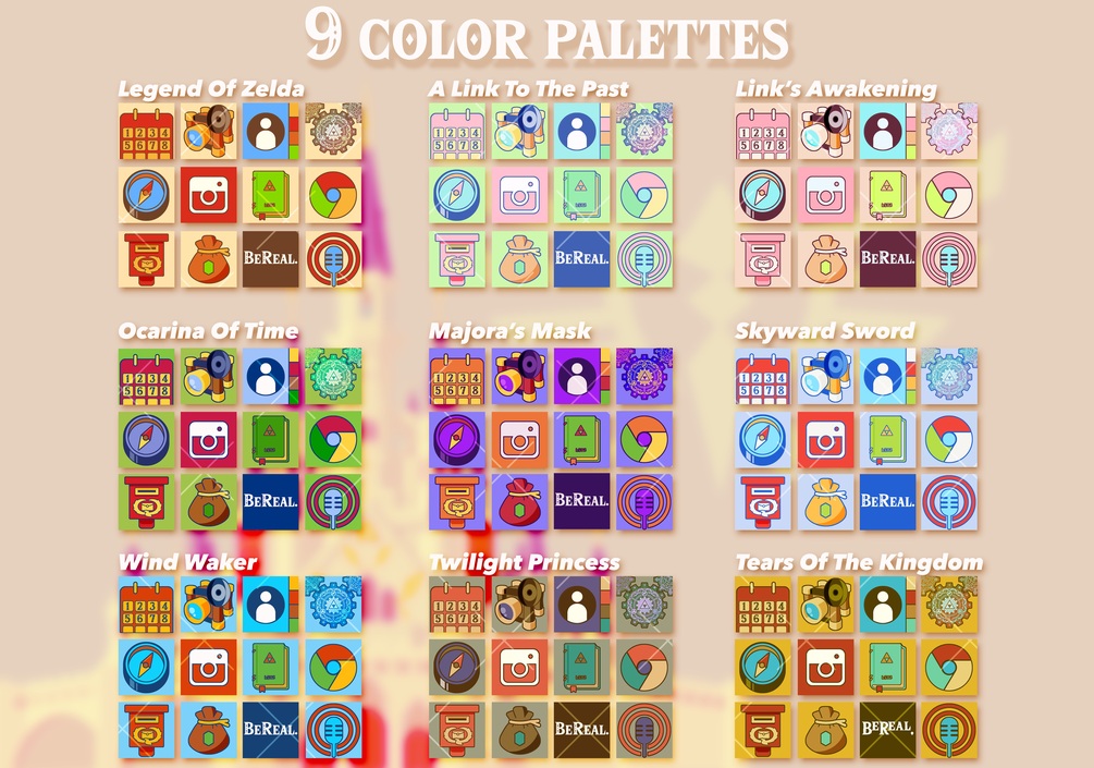 Each icon comes in 9 colour variation. Each colour palette is inspired by the ambience of 9 different Zelda game.